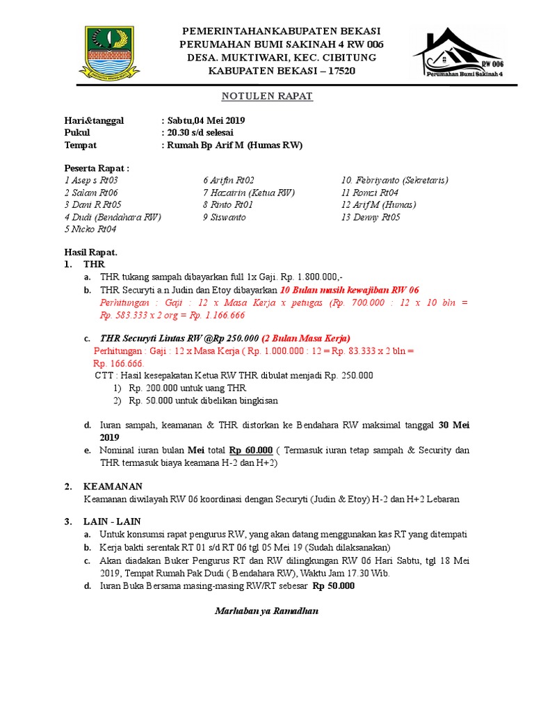 Notulen musyawarah warga rt05 22 maret 2012 rw09 mengadakan rapat persiapan hut ri ke 71 tahun 2016. Berita acara rapat pengurus rt rw 28 okt 2017. Inovasi baru dilaksanakan oleh warga RT6 RWIII Kelurahan Kramat Utara Kota Magelang yaitu rapat RT bulan Oktober 2014 dilaksanakan tidak khusus Rapat RT dengan duduk dikursi dan didalam rumah dengan pakaian resmi tetapi dilaksanakan langsung setelah Kerja Bakti dengan pakaian seadanya dan lesehan disekitar lokasi Kerja Bakti.