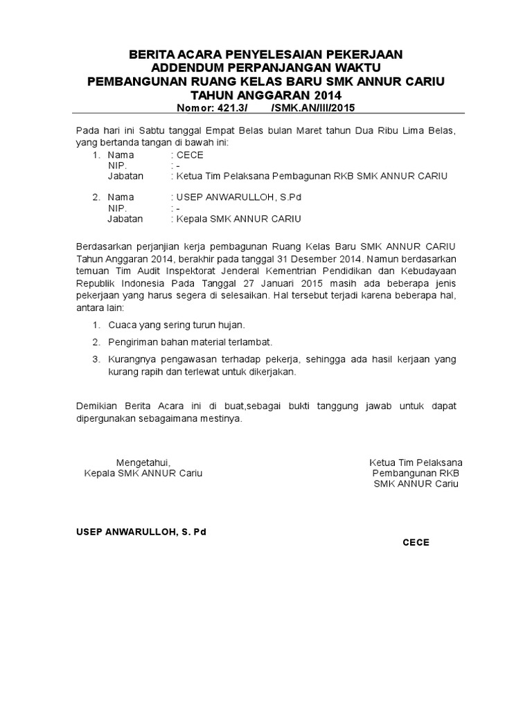 Contoh Surat Addendum Perpanjangan Waktu Kontrak Kerja They are so many great picture list that may become your ideas and informational purpose of Contoh Surat Permohonan Addendum Kontrak design ideas on your own collections. Contoh surat addendum perpanjangan waktu pekerjaan surat p. 17112014 Tentang perjanjian kontrak Pekerjaan Pengadaan Judul Pengadaan BarangJasa yang akan berakhir pada tanggal Akhir tanggal kontrak maka dengan ini saya mengajukan surat permohonan perpanjangan kontrak kerja waktu pekerjaan selama 15 hari kalender disesuaikan dengan kemungkinan berapa lama pekerjaan akan selesai terhitung dari tanggal habis kontrak.